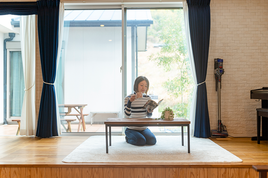 段下がりのリビングと季節を感じるタイルデッキのお家