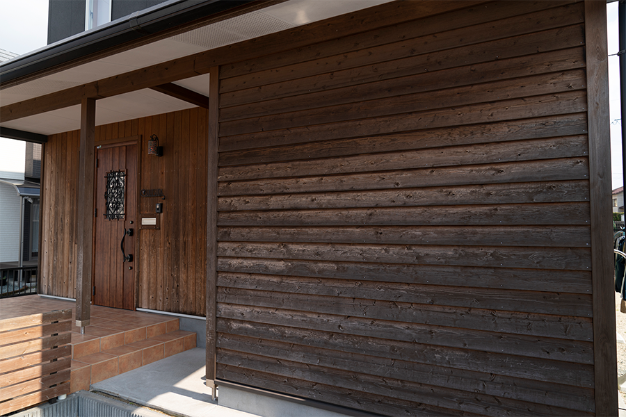 西日・西風を遮る 鎧張(よろいばり)の壁を備えました。 もちろん背面は駐輪や収納を兼ねています。